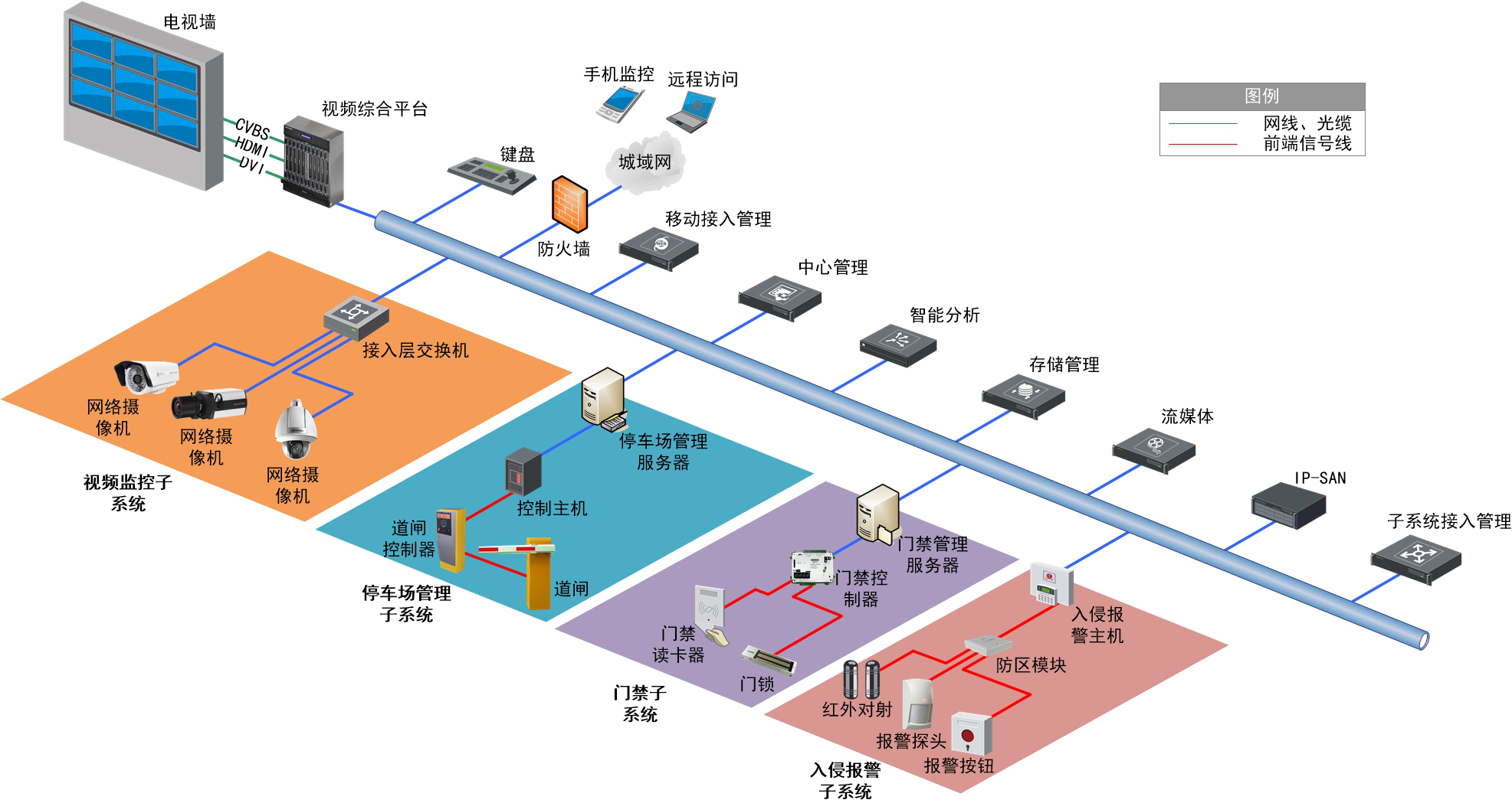 “教學實訓+實操應用(yòng)”相(xiàng∑ ✘>)互結合的(de)網絡安防系統專業(yè)理(l←₩↓ǐ)實一(yī)體(tǐ)化(huà)實訓室,包含:視(s>™₹≈hì)頻(pín)監控系統、門(mén)禁與≠¶☆對(duì)講系統、入侵報(bào)警系統等,拓撲結構如(rú)圖2-&±>1。