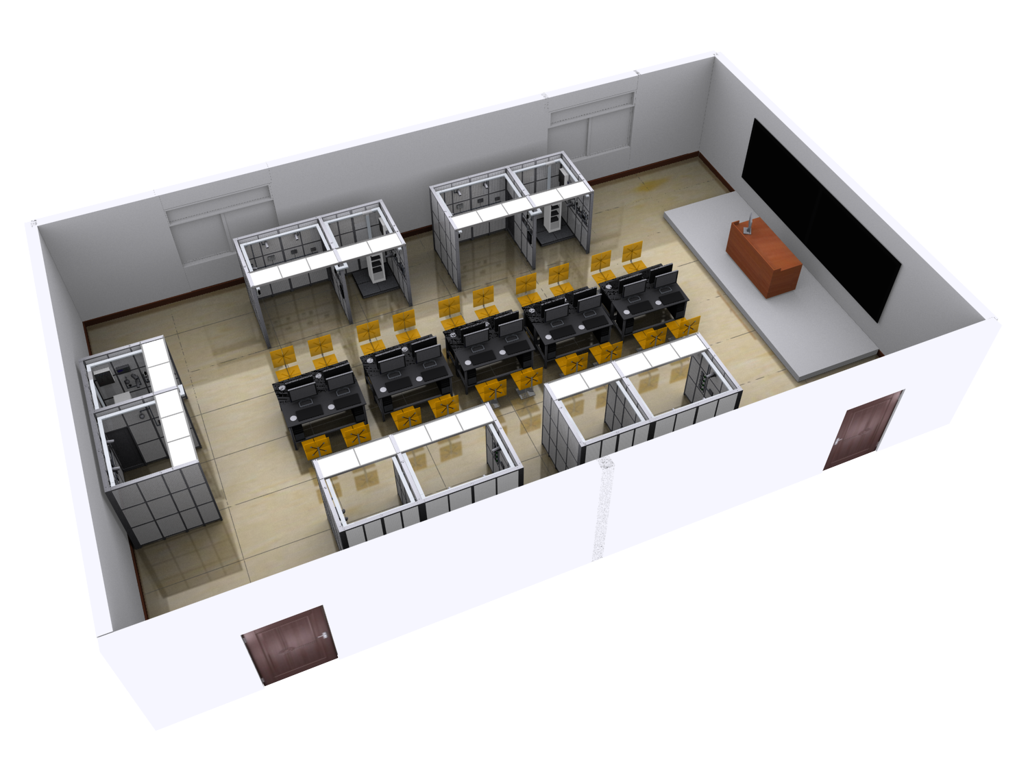 網絡安防系統的(de)安裝與維護實訓室為(wèi)的(de)長(cβ✔ háng)方形結構,以下(xià)是(shì)五組的(de)設計(j>'¶γì)效果圖如(rú)下(xià):