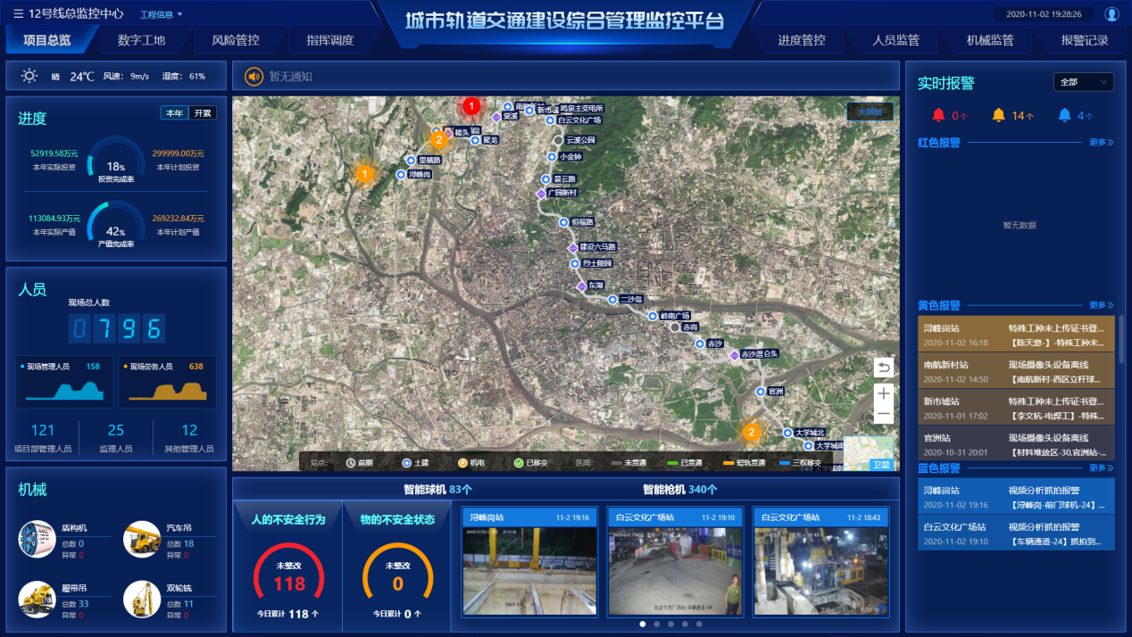 本項目“綜合監控系統(智慧工(gōng)地(dì))”的(de)設計(jì☆€∏∏)、建設和(hé)應用(yòng),以達到(dà'→o)“防風(fēng)險、保安全、促生(>‌γshēng)産”為(wèi)出發點,以滿•Ω足廣州地(dì)鐵(tiě)、廣州市(shì)軌道(dàoβα≥φ)交通(tōng)十二号線總承包項目經理(lǐ)部、廣州市(shì)軌道(‍♠dào)交通(tōng)十二号線8個(gè)項目部、廣州市(shì)軌道( ÷>dào)交通(tōng)十二号線25個(gè)工(gōng)點(站(∞<¥₩zhàn)點或區(qū)間(jiān))的(de)多(duō)層級管理(lǐ) ♣為(wèi)基本需求,實現(xiàn)現(xiàn)場(c<≠hǎng)實時(shí)信息掌控,為(wèi)₹☆≥β全線綜合監控提供有(yǒu)效途徑和(hé)便捷'₩≠α方式。